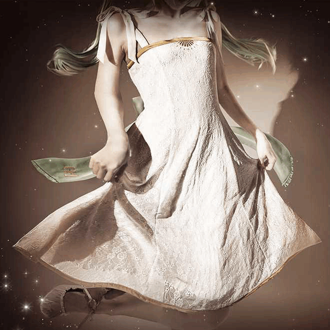 Crafted in crisp white fabric with subtle gold trim, this dress mirrors the elegance of Miku’s symphonic concert attire. The tailored yet flowing cut ensures a graceful drape, while understated detailing keeps the design timeless and versatile.